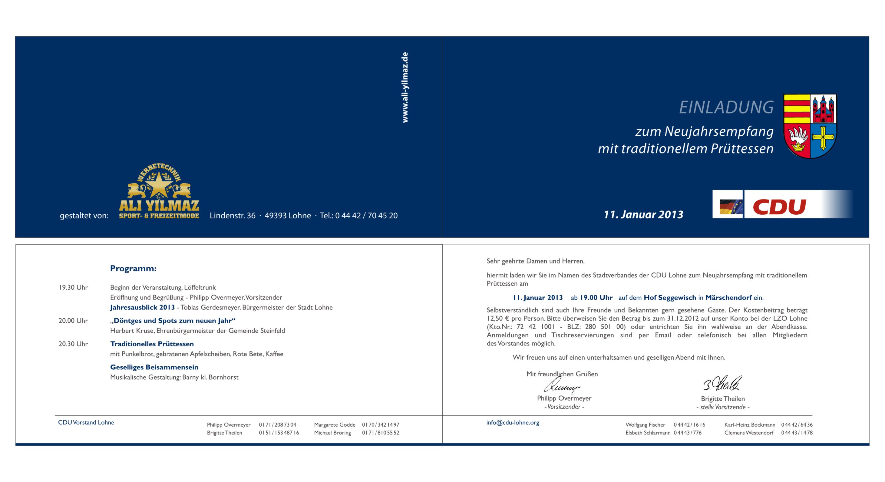 hiermit laden wir Sie im Namen des Vorstandes des CDU Standverbandes Lohne zum Neujahrsempfang mit traditionellem Prüttessen am 11.01.2013 ab 19.00 Uhr auf dem Hof Seggewisch ein (Infos siehe Anlage).